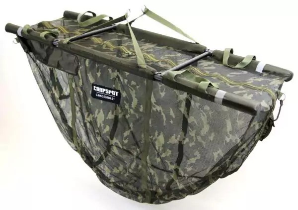 Die Carpspot CamoSling S1 ist die ideale Sling zum sicheren Hältern, Wiegen, Fotografieren und Zurücksetzen Ihres Fangs. Diese Wiegeschlinge ist enorm stabil, extrem leicht und bietet dank integrierter reflektierender Schwimmkörper, großem Netz und durchgehendem Reißverschluss die Möglichkeit den Fisch vorübergehend, schonend zu hältern, um beispielsweise die Abhakmatte oder Fotoausrüstung vorzubereiten. Ihre Leichtigkeit erhält sie durch die 2 eingearbeiteten Carbonstangen, die bei sämtlichen Konkurenzprodukten stets aus Alu oder sogar Stahl sind. 6 Tragegriffe, zwei Edelstahlösen (eine an jedem Ende der Sling) sowie ein Karabiner, der ein ungewolltes Öffnen der sehr hochwertigen und leichtgängigen Reißverschlüsse verhindert, runden die Ausstattung ab.