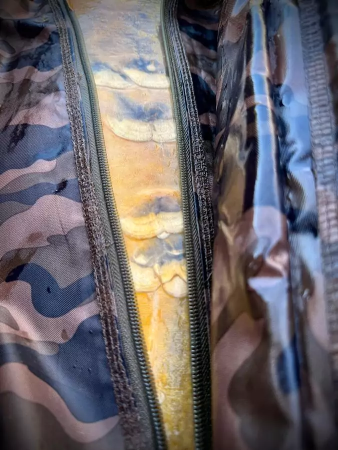 Zum einen war unser Ziel, den Fisch noch schonender zu behandeln, wodurch wir das Mesh-Material am Boden durch ein CamoNylon ersetzt haben. Für die passende Optik zieht sich dieses Camo gleich bis zum oberen Teil der Sling, was ihr ein komplett neues Design verschafft.