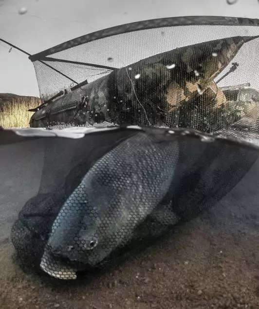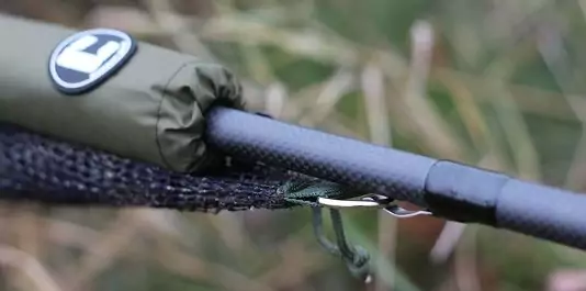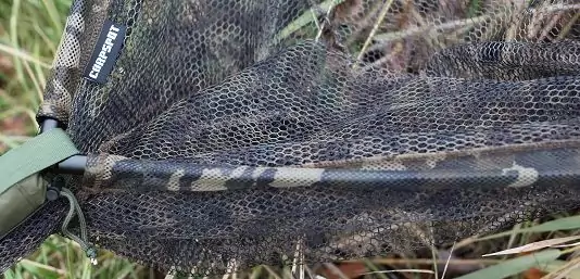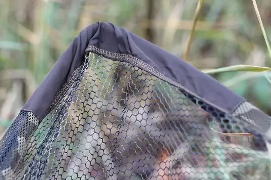 Das camouflage Netz ist äußerst robust, besitzt doppelte Nähte, besteht aus einem fischschonenden, grobmaschigen Nylon-Material und hat extra verstärkte Ecken. Weiterhin ist eine große Schlaufe eingenäht, durch die das Netz gefädelt wird und dann in dem gefederten Edelstahlclip hinter dem mitgelieferten Netfloat eingeklipst wird. Dies ermöglicht es, das leichte Landingnet C2 mühelos im und außerhalb des Wasser zu manövrieren. Beim Herausheben aus dem Wasser gibt der Clip das Netz wieder frei.