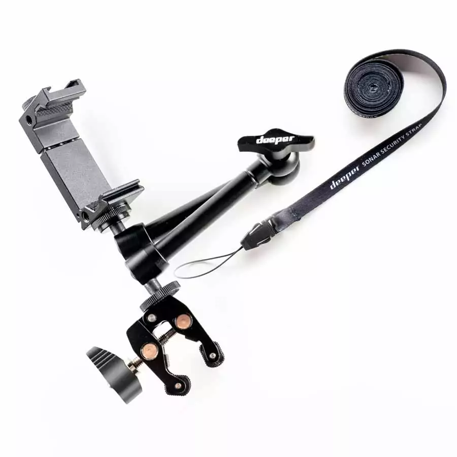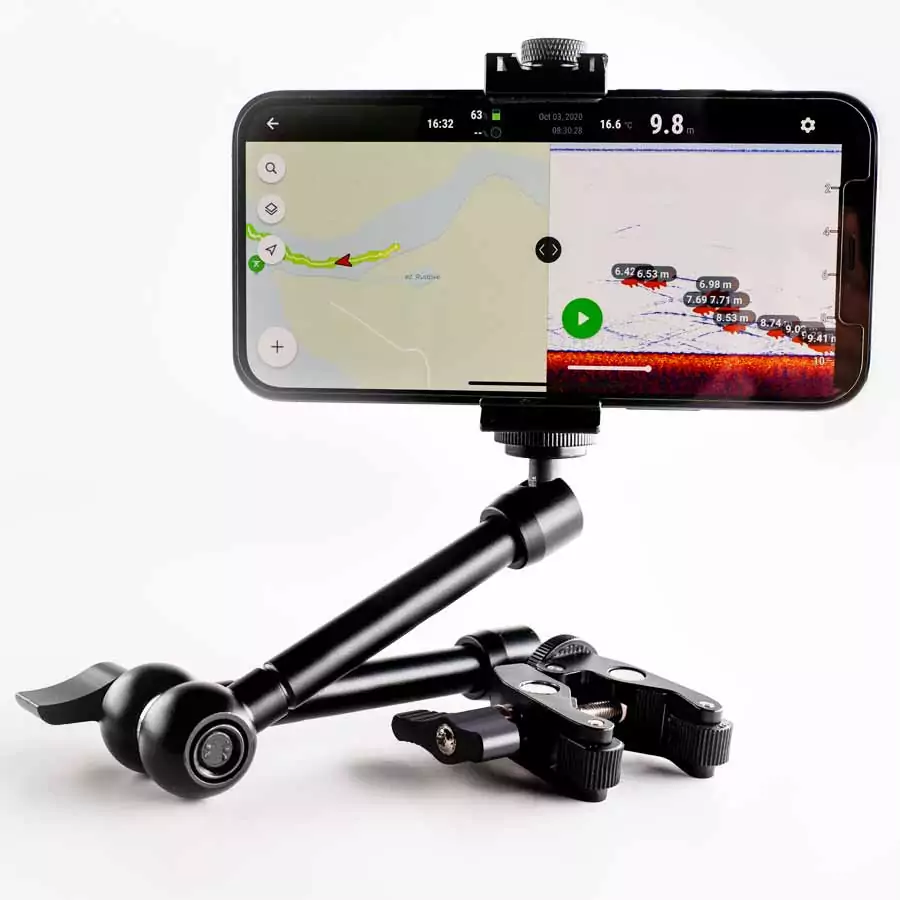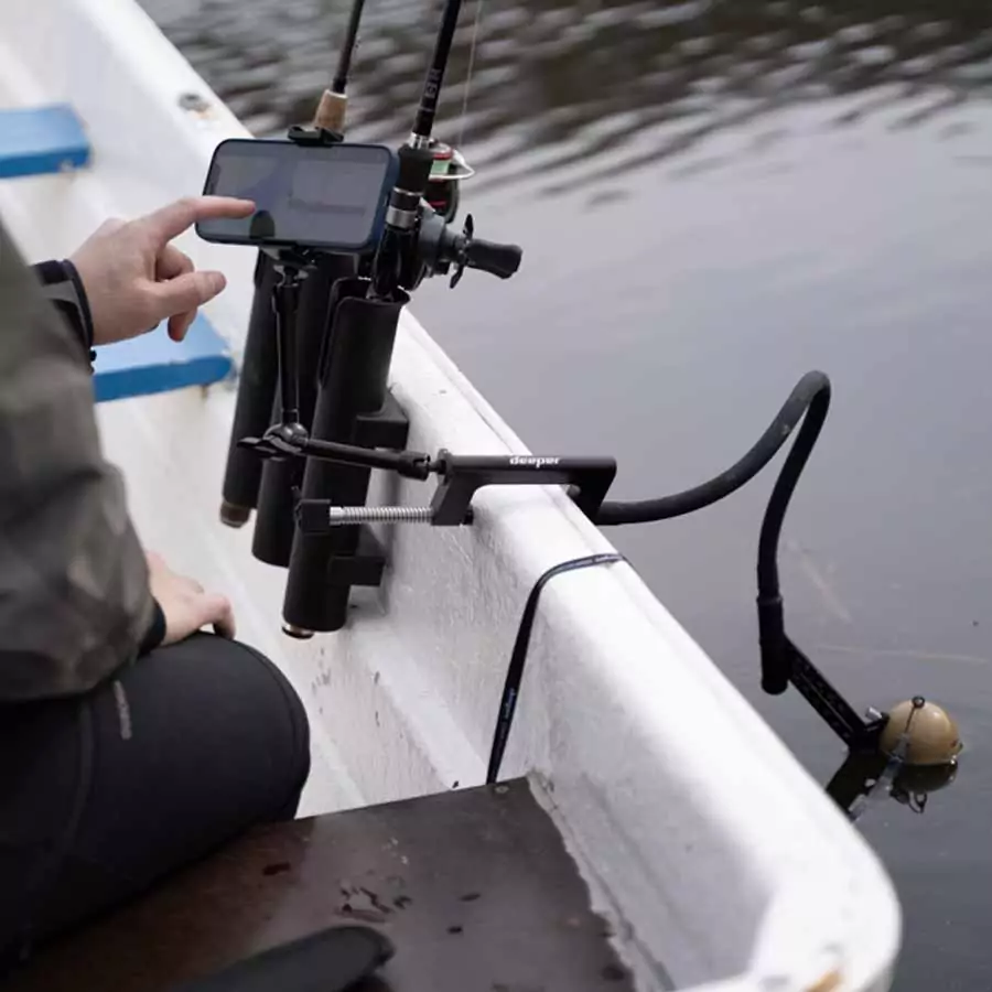 Deeper Smartphone Holder – Handyhalterung für Boote – Die Halterung von Deeper ist eine gute Handyhalterung, die für das Aufnehmen eines Smartphones auf einem Angelboot oder einem Kayak gebaut wurde. Der 28cm lange Arm ermöglicht eine vielseitige Ausrichtung des Handys. Die Handyaufnahme ist mit Gummipads ausgestattet, um das Telefon auch in rauen Bedingungen sicher zu halten. Mit der C-Klemme oder dem T-Bolzen kann die Halterung am Boot befestigt werden.