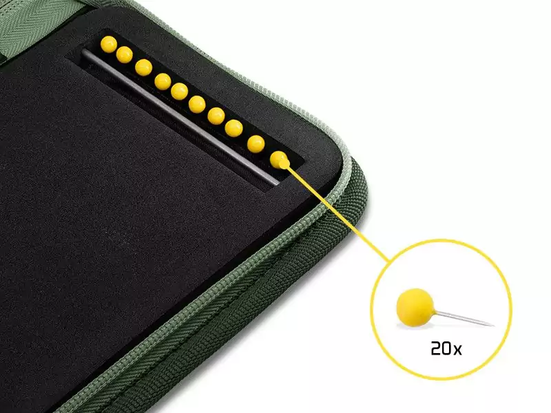 Delphin Rig SPACE C2G ist ein neues, erweitertes Etui, mit dem Sie die nächste Stufe der Organisation und des Schutzes für Ihre langen Vorfächer erreichen. Mit diesem Etui verschwenden Sie keine Zeit mehr mit dem Entwirren von Knoten oder mühsamen Binden von neuen Vorfächern am Wasser, wenn die Fische gerade aktiv sind. Das Etui ist sehr hochwertig und sein Inneres besteht aus dem langlebigen, gehärteten Schaumstoff mit zwei Ausschnitten. In den Ausschnitten befinden sich die Stahlstangen zum Einhängen der Haken. Zum Spannen und Befestigen der Vorfächer auf dem Schaumstoff ist das Etui mit 20 Stiften ausgestattet, die es ermöglichen, immer eine ausreichende Menge an vorbereiteten Vorfächern zur Verfügung zu haben, was sowohl von den Anfängern als auch von den erfahrenen Anglern geschätzt wird.