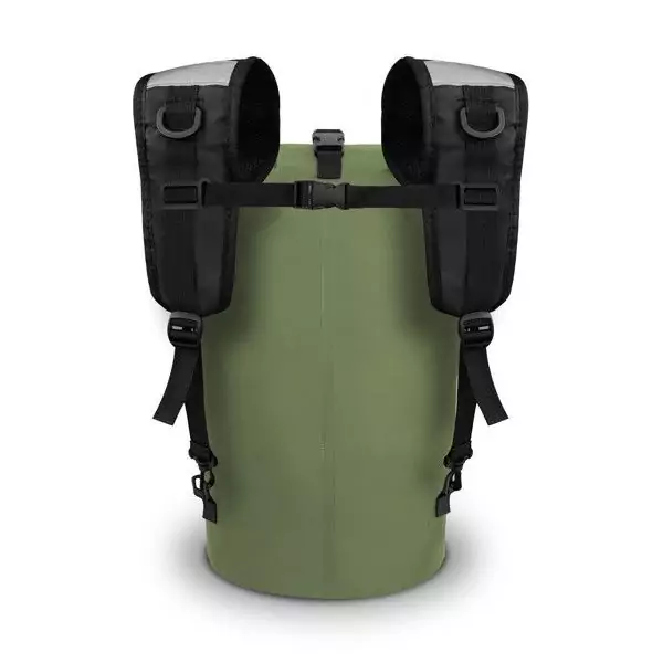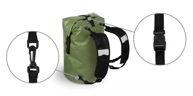 Der Verschluss des Rucksacks wird durch einen stabilen Riemen mit zwei Clips an der Oberseite des Rucksacks gesichert, den man in der Eile ein paar Mal aufrollt und die Clips auf ihrer anderen Hälfte an der Tasche befestigt. Für die zusätzliche Sicherheit nach dem Verschließen sorgt ein weiterer Kunststoffclip an der Oberseite. Für den einfachen und schnellen Transport wurden ein praktischer Gummigriff und Schultergurte angebracht, die an beiden Enden mit den Clips befestigt werden können, so dass sie jederzeit abgenommen werden können. Die Gurte sind ausreichend gepolstert und wir haben auf der Innenseite perforierten Stoff verwendet, um eine bessere Belüftung während des Tragens zu ermöglichen. Außerdem sind sie verstellbar, mit einem Kunststoffclip zum Verbinden und zwei Rückstrahlern zur besseren Sichtbarkeit ausgestattet.