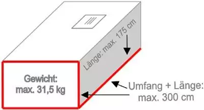 Kosten pro Paket mit einer Maximallänge von 175cm, einem Gurtmaß von maximal 3,00m (=1x längste Seite + 2x Breite + 2x Höhe) und einem Maximalgewicht von 31,5kg